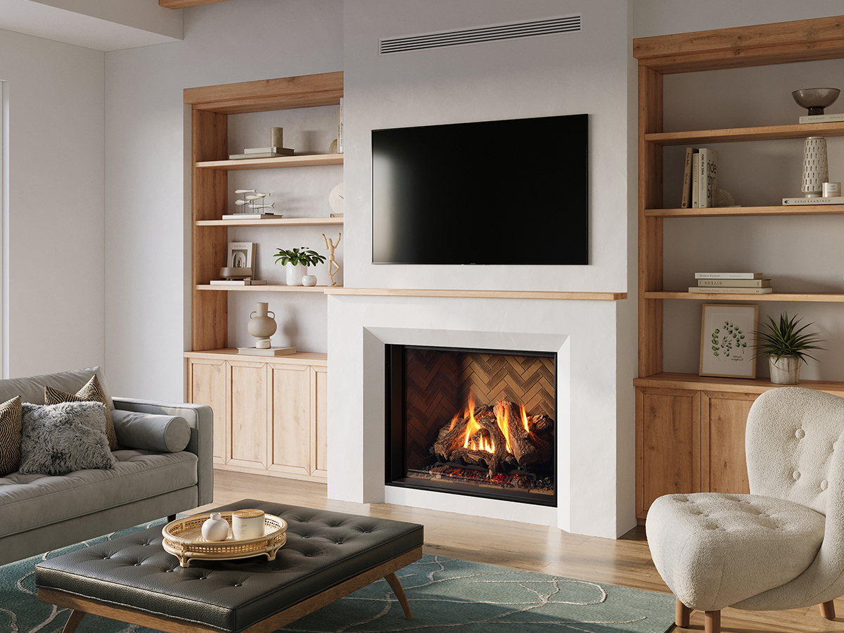 A fireplace TV wall delivers modern style without compromise. Regency fireplaces are engineered for TVs mounted above the fireplace, featuring the innovative Cool Wall™ System to keep wall surfaces cool and protected.